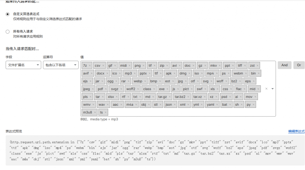 我设置的的规则如下:(http.request.uri.path.extension in {"7z" "csv" "gif" "midi" "png" "tif" "zip" "avi" "doc" "gz" "mkv" "ppt" "tiff" "zst" "avif" "docx" "ico" "mp3" "pptx" "ttf" "apk" "dmg" "iso" "mp4" "ps" "webm" "bin" "ejs" "jar" "ogg" "rar" "webp" "bmp" "eot" "jpg" "otf" "svg" "woff" "bz2" "eps" "jpeg" "pdf" "svgz" "woff2" "class" "exe" "js" "pict" "swf" "xls" "css" "flac" "mid" "pls" "tar" "xlsx" "rtf" "txt" "md" "tar.gz" "tar.bz2" "tar.xz" "xz" "psd" "ai" "mov" "wmv" "wav" "aac" "m4a" "obj" "stl" "json" "xml" "yml" "yaml" "bat" "sh" "py" "m3u8" "ts"})