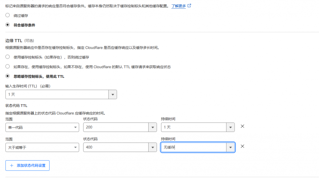 边缘TTL:CF 会将你的数据缓存在他的节点上,缓存多久,这里直接选 1 年,也可以选其它的,根据你实际情况。